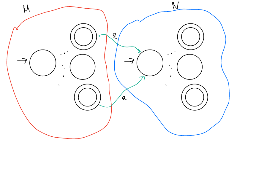 Let \(M\) and \(N\) be DFAs for \(A\) and \(B\) respectively. We’ll show that \(AB\) is regular by finding an NFA \(H\) for \(AB\).