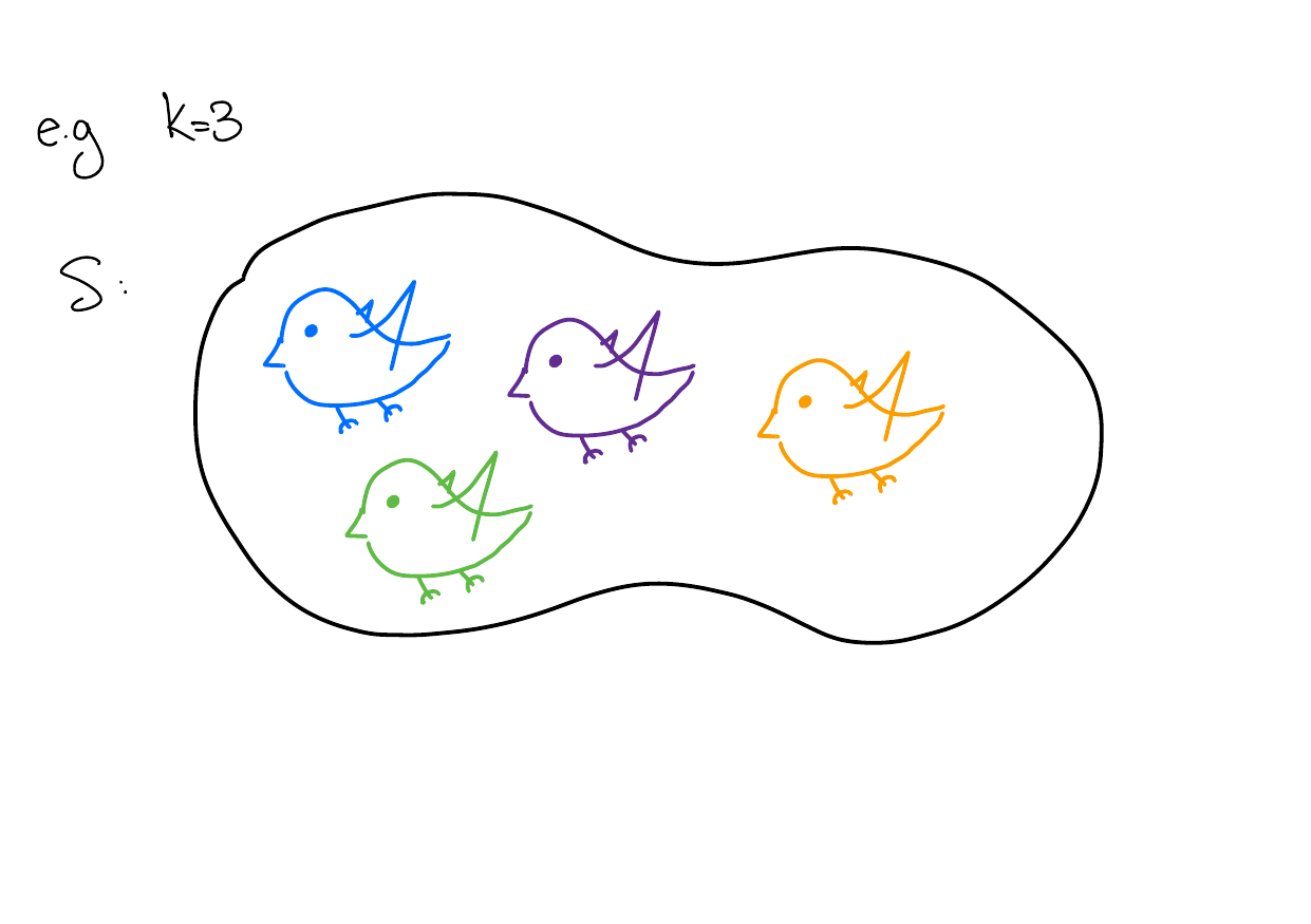 Inductive step. Let \(k \in \mathbb{N}\) be any number and assume a set of \(k\) birds will all have the same color. Let \(S\) be a set of \(k + 1\) birds. We’ll show that all the birds in \(S\) have the same color.