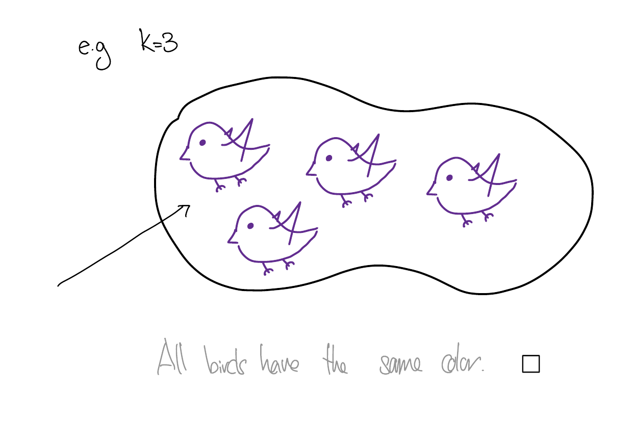 This example is usually “all horses have the same color,” but I do not know how to draw horses - hence “all birds have the same color”.↩︎