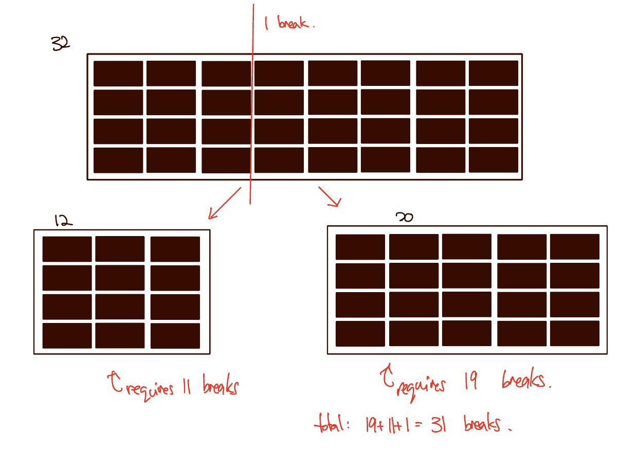 Claim: Let \(n \in \mathbb{N}, n \geq 1\) be any natural number. A chocolate bar with \(n\) individual pieces requires \(n-1\) breaks to split the bar into individual pieces.