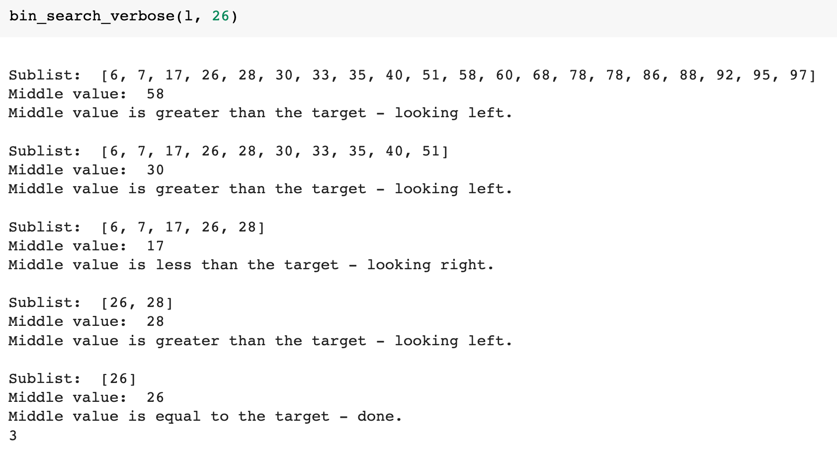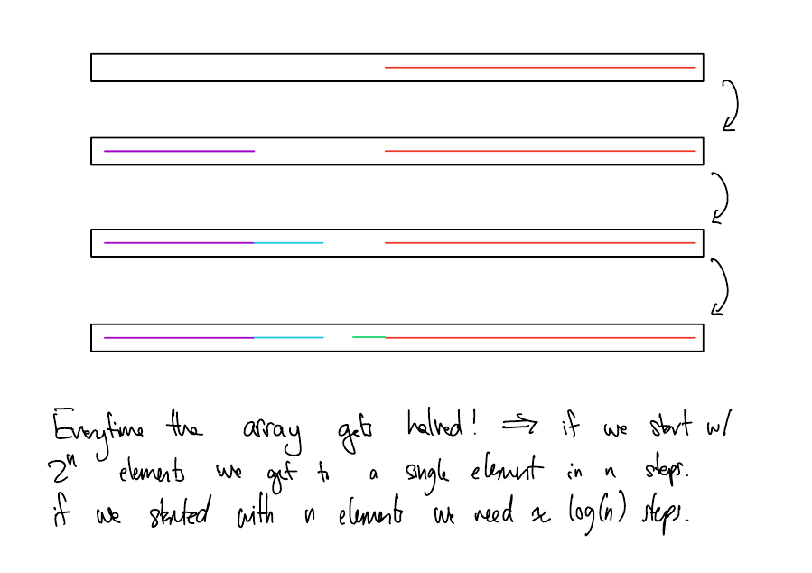 where the third inequality holds by the inductive hypothesis since \(\left\lfloor \frac{x}{2} \right\rfloor \leq 2^i -1\), as \(x \leq 2^{i+1} - 1\). This completes the induction. Note this means \(T_\mathrm{BinSearch}(n) = \left\lfloor \log(n) \right\rfloor+2\) for \(n \in \mathbb{N},n \geq 1\).