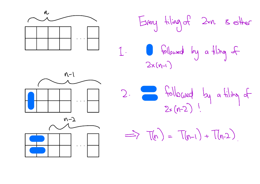 Let \(T(n)\) be the number of tilings of a \(2\times n\) grid using \(2\times 1\) dominoes.