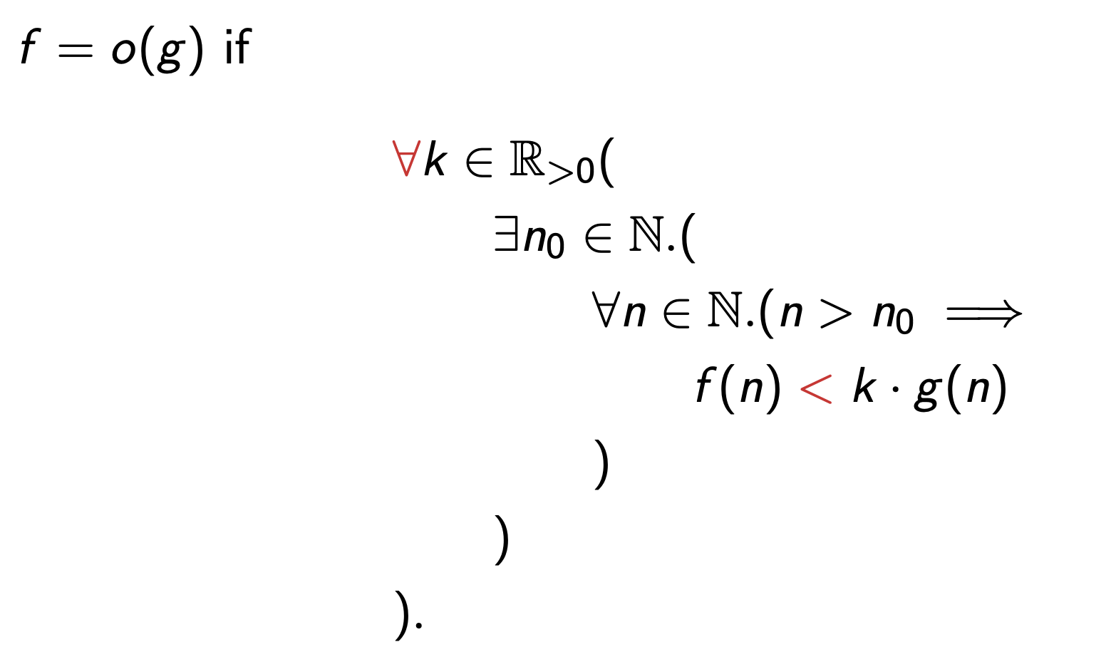 Less formally, no matter how small a constant \(k\) I multiply \(g\) by, for all large enough inputs, \(f(n)\) is less than \(g(n)\).
