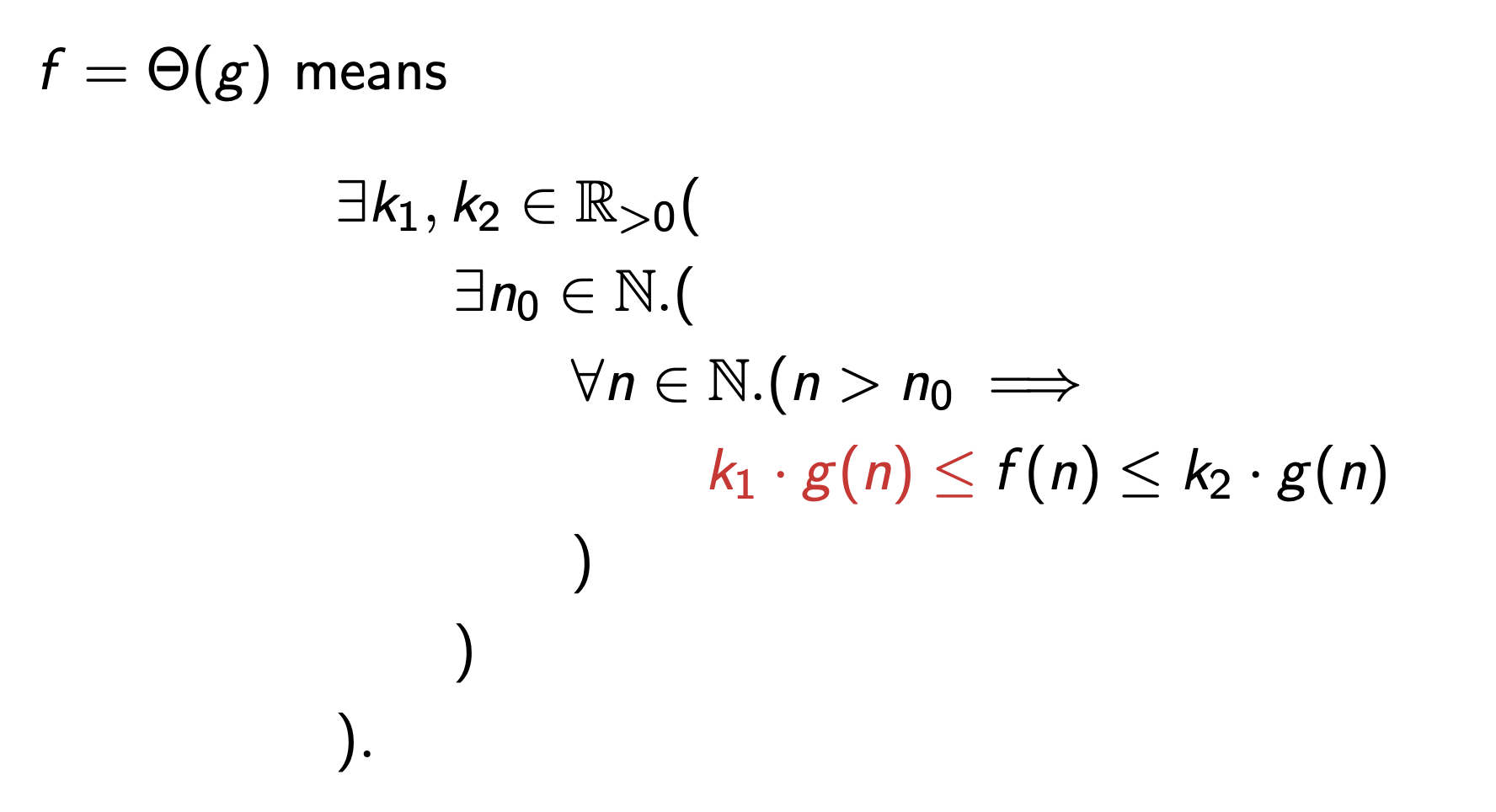 Less formally, \(f\) is between \(k_1\cdot g(n)\) and \(k_2\cdot g(n)\) for large enough inputs, where \(k_1\) and \(k_2\) are some constants.