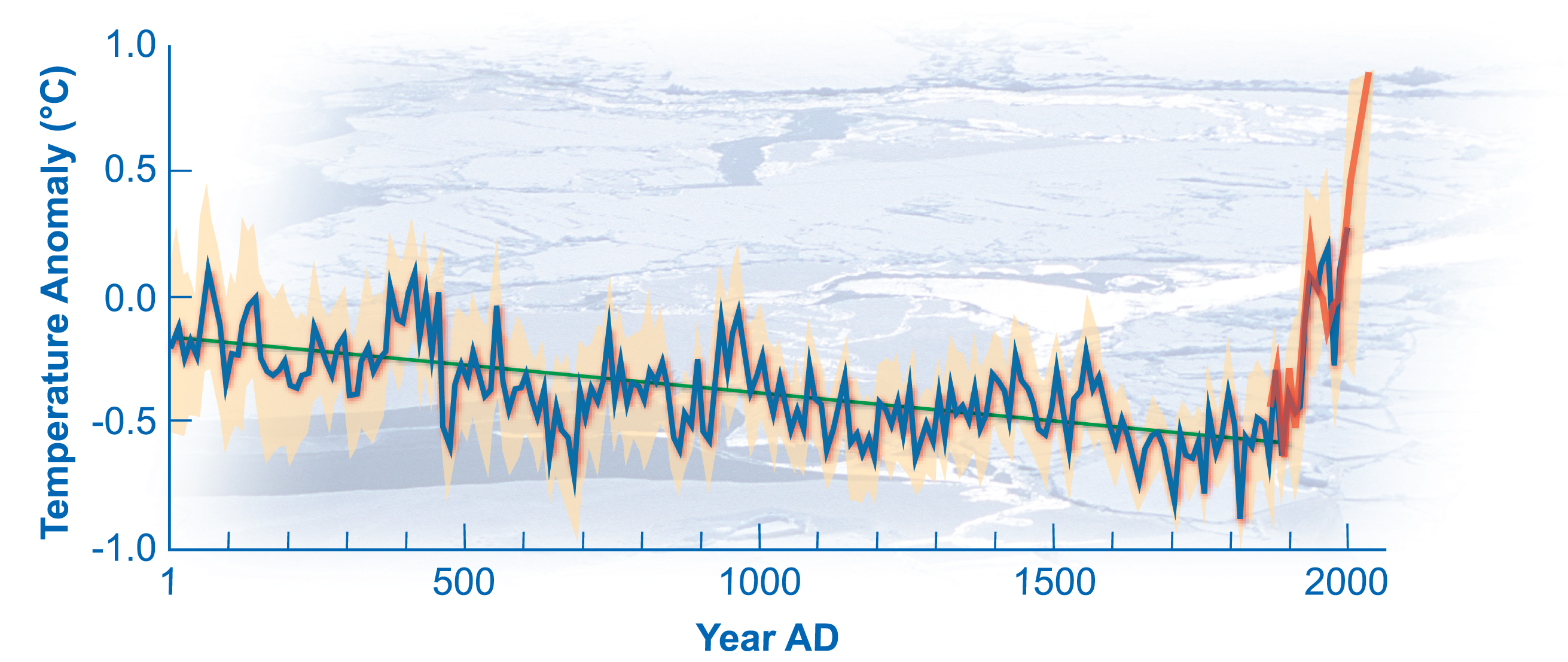 There are many signs that something is wrong with the life support system for planet Earth. For example, temperatures across the planet are now higher than they have been for thousands of years. Here's a temperature series from the Arctic, showing a steady cooling trend over the last thousand years, suddenly reversed with a sharp warming trend over the last century.