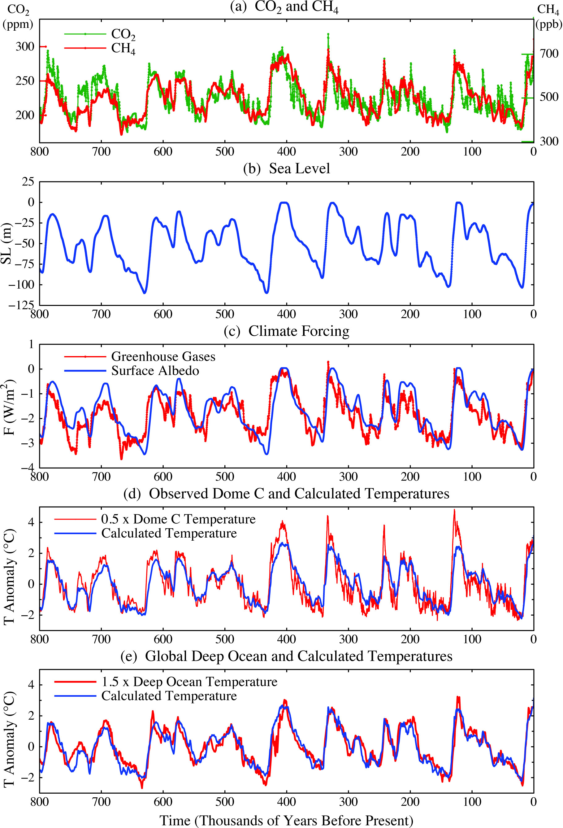 Such warming has happened before. This graph shows the global temperature estimates over the last 800,000 years, reconstructed from the oldest ice core, the Epica Dome C. The troughs in the graph were the ice ages, when ice sheets more than a kilometre thick expanded across North America and Northern Europe. The peaks are the inter-glacials, when the ice retreated. Note that the global temperature difference between the ice ages and the interglacials is only around 4-5°C. The ice ages were triggered by the Milankovitch Cycles, changes in the earth's orbit, which alter the amount of sunlight at the poles. However, the orbital variations aren't big enough to cause this much temperature change. Rather, they act as a trigger. For example, as an ice age ends, the orbital change causes a very slight warming. This in turn triggers two feedback effects: a release of carbon dioxide trapped in the ice, and a reduction of the earth's albedo as the ice sheets melt. Both these effects in turn cause a lot more warming. At the start of an ice age, a similar sequence causes the cooling process.