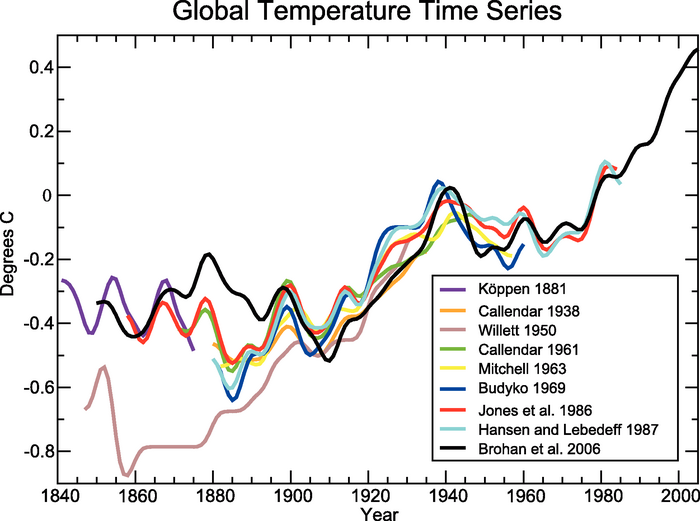 Many lines of evidence show the warming. For example, this graphs shows a number of different studies that have analyzed global temperatures over the 150 years since 1850. The further back you go, the more variability there is, because of differences in how temperature readings were taken. But over the 20th Century, the trend is clear: 40 years of strong warming until about 1940, then a slight slight cooling until the 1980s, and finally, a strong warming signal since then. The overall warming is very clear, but it's not the only variability in the graph - a good theory ought to explain the overall warming, as well as the the other, shorter patterns. We'll come back to that pattern of post-war cooling shortly. Note: when we talk about temperature changes ("anomalies"), we have to say change with respect to what. The usual convention is to take the average temperature from the last quarter of the 20th Century, and call that zero; temperatures colder than this will be shown as negative, temperatures warmer will be shown as positive. In this particular graph they used the average from the period 1961-1990 as "zero". We'll need to check carefully what "zero" means on any temperature anomaly graph. |