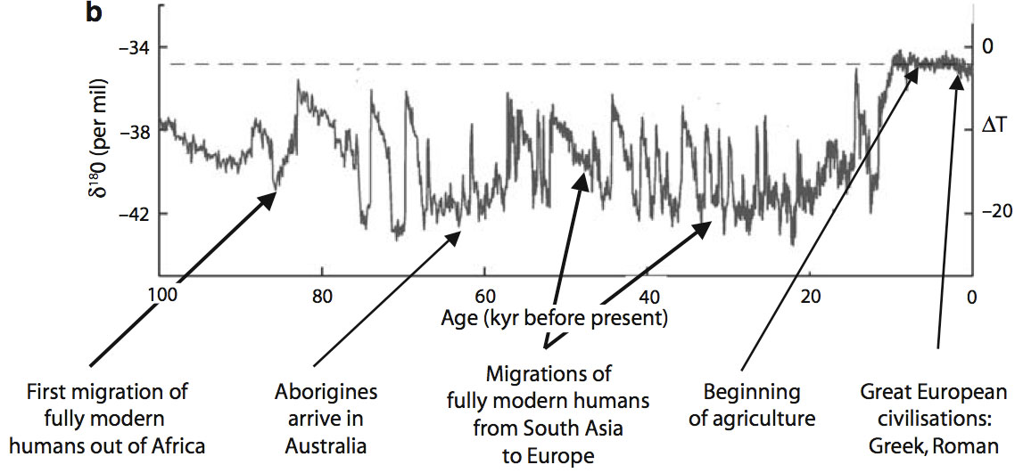 But human civilization wasn't around last time we had massive climate shifts. In fact, in the last 10,000 years, the period in which humans transitioned from hunter-gathers to an agricultural society, saw a remarkably stable period in the earth's climate. This graph, of Greenland temperature variations, shows just the last 100,000 years. The last ice age ended about 10,000 years ago. Note: This graph, from the Greenland ice sheet project (GISP), plots local temperatures in Greenland, rather than global temperatures. The corresponding global temperature shift at the end of the last ice age was about 5°C.